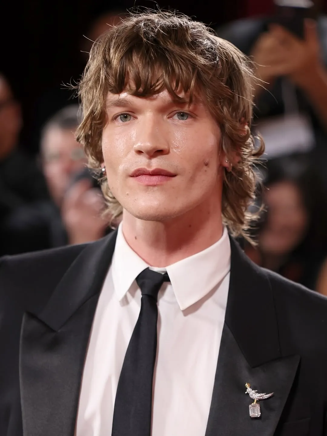 On Storrie’s lapel: Jean Schlumberger’s Bird on a Rock brooch in platinum and 18k yellow gold, set with a diamond of over 13 carats, diamonds, and a pink sapphire. He layered Tiffany T T1 hoop earrings in white gold with diamonds, a Tiffany Lock bangle in full pavé diamonds, a Union Square 30 mm mechanical watch in yellow gold, and a Tiffany Knot double-row ring in yellow gold with diamonds.